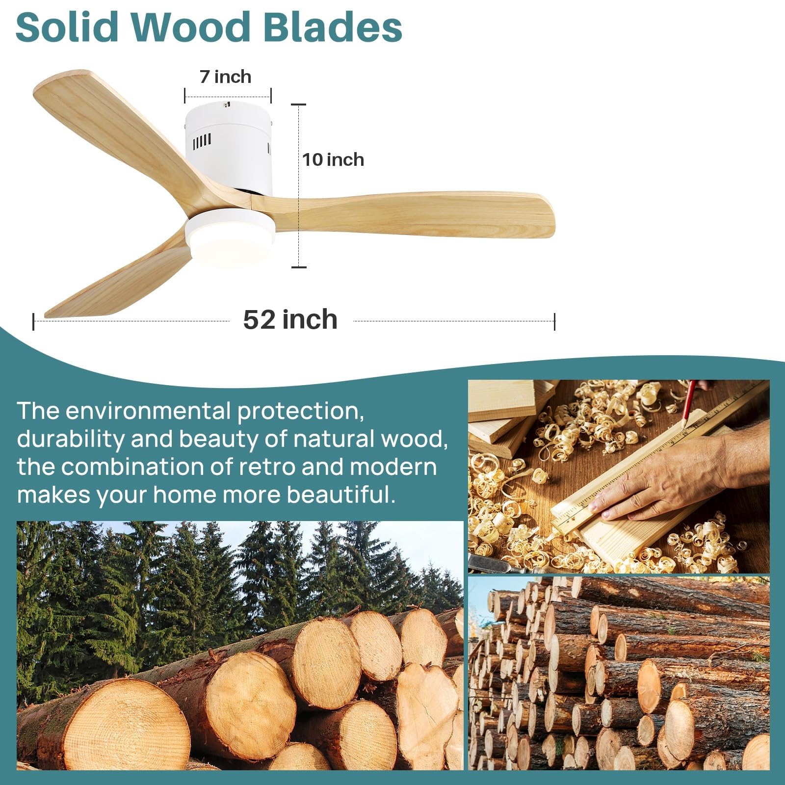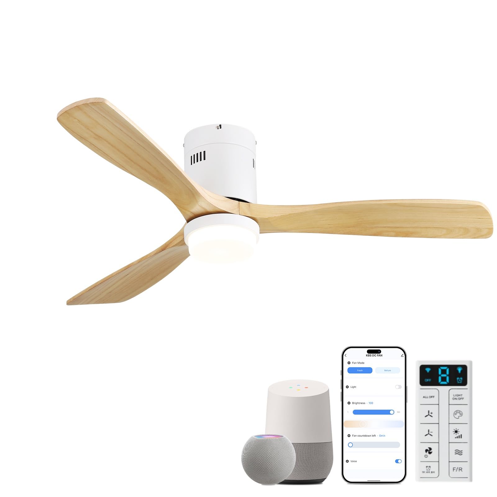 Ceiling Fan with Lights-52 Inch Flush Mount Ceiling Fan with Light and Remote Control, Low Profile Wood Blades Modern Outdoor Ceiling Fans for Bedroom/Farmhouse/Patio/Indoor, Quiet DC Motor