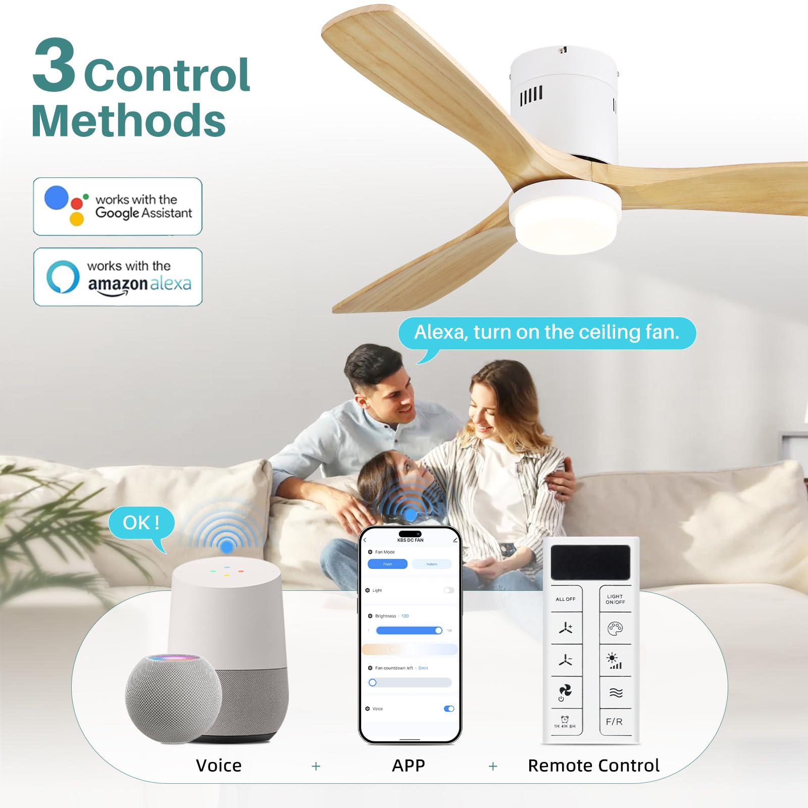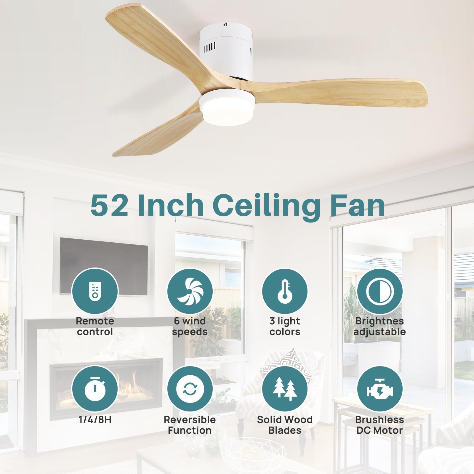 • 6 Adjustable Fan Speeds:Enjoy the ultimate comfort of our low-profile ceiling fan featuring 3 wood blades that deliver high cfm airflow up to 5800 CFM. Change from breeze to strong airflow and adjust white light (warm to cool) with just one remote. Set 1/4/8 hour auto-off timer. Operate fan and light independently. (Once fixed, the remote can be used as a wall switch.)