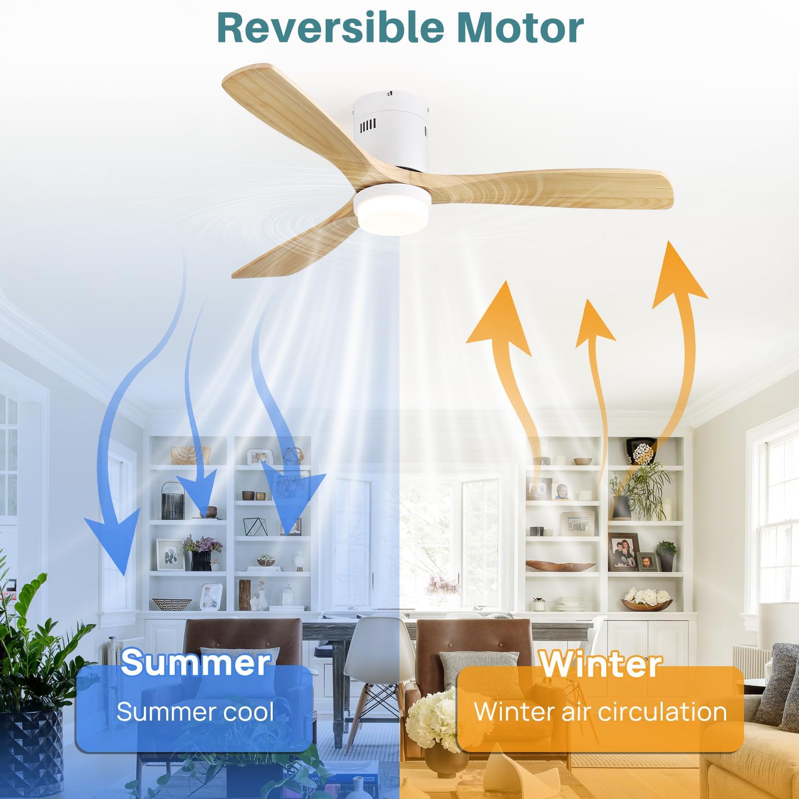 • Reversible DC Motor:Lets you customize airflow for year-round comfort. In summer, press the downward button on the remote control to quickly cool the room. During winter, reverse the fan to circulate warm air trapped near the ceiling—cutting heating costs while keeping spaces cozy. Its smooth, adjustable settings work for all ages, letting everyone enjoy gentle airflow exactly as they like.